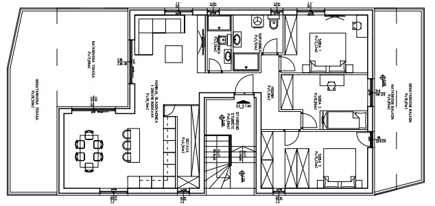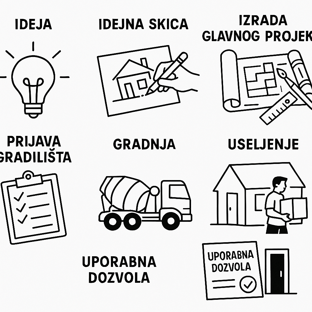 Prvi vizualni prikaz ideje – jednostavna skica kuće, raspored prostorija, osnovni oblik. Služi kao temelj za daljnje projektiranje.